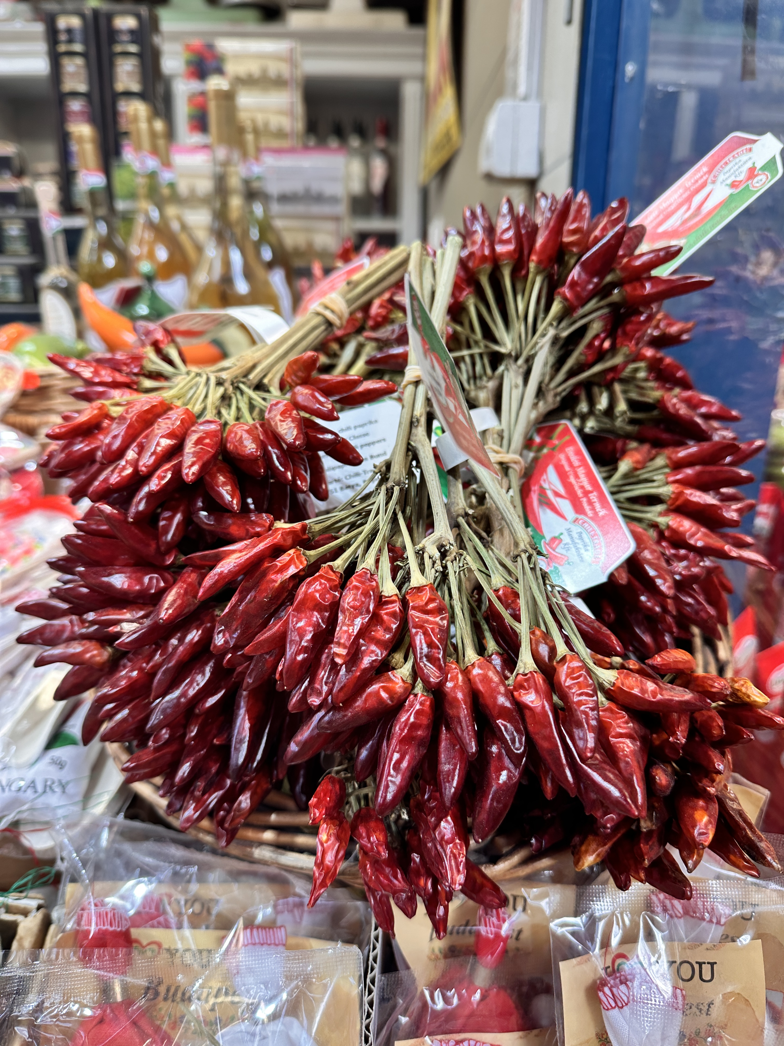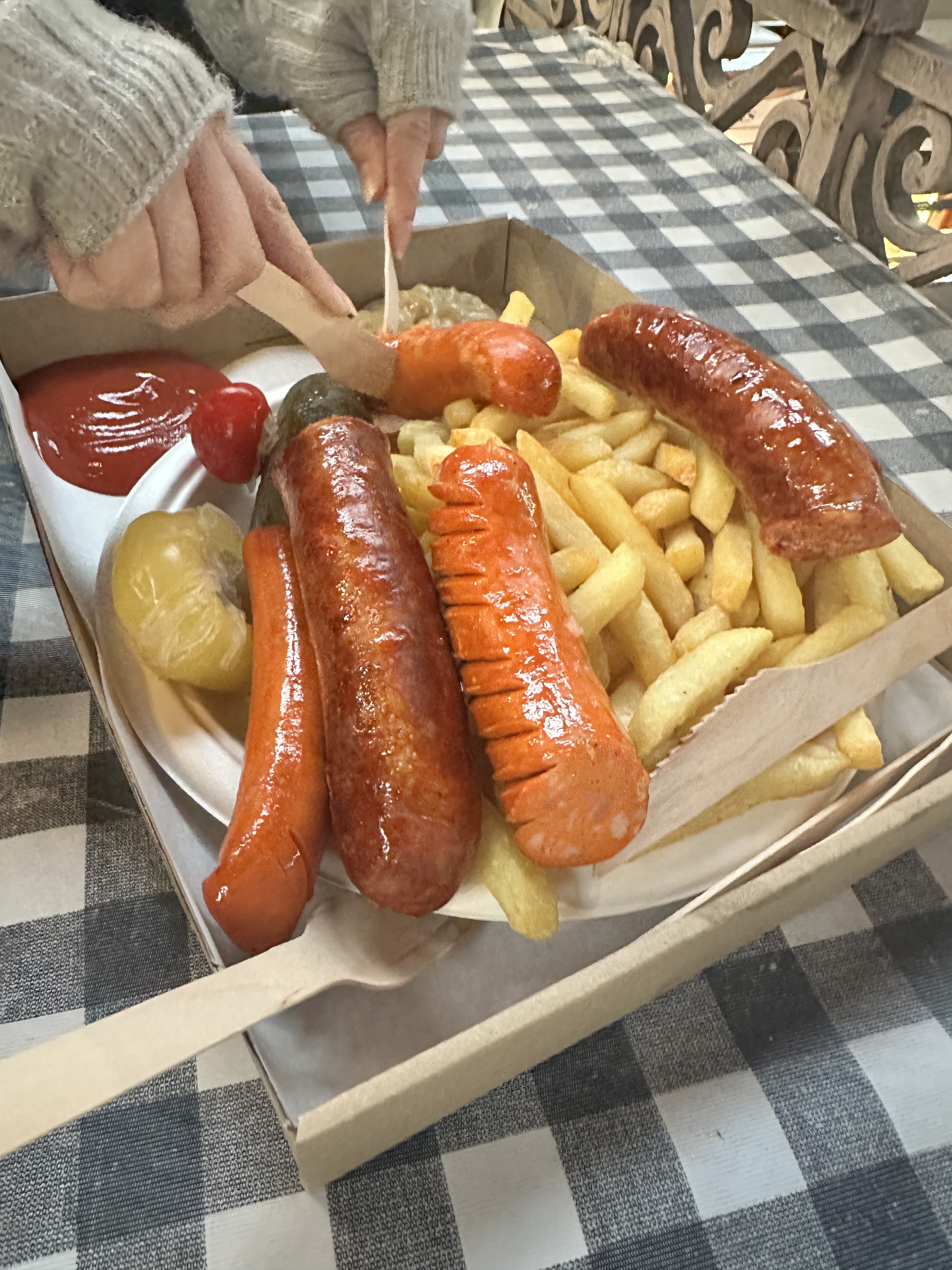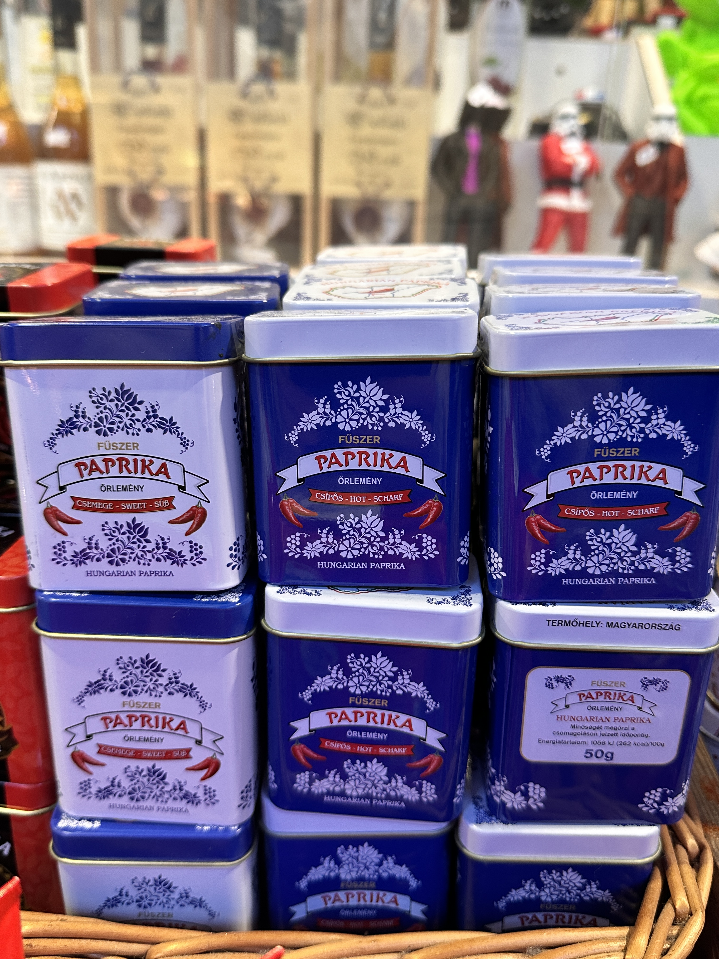 Restored in the 1990s the Neo-Gothic building was pretty spectacular. It has two storeys filled with Hungarian foods – a lot of salami – and crafts including a lot of Christmas decorations. I made a beeline for the hot and sweet smoked paprika in the pretty blue and white tins. The upper level has lots of eating options, where you can stand and watch the throngs below or sit down in a canteen style eatery. We devoured a few large Hungarian sausages known as kolbász, that are seasoned with a distinctive blend of spices, most notably paprika, served alongside some fries, pickles, and mustard. Delicious and £27 for the huge plate below.