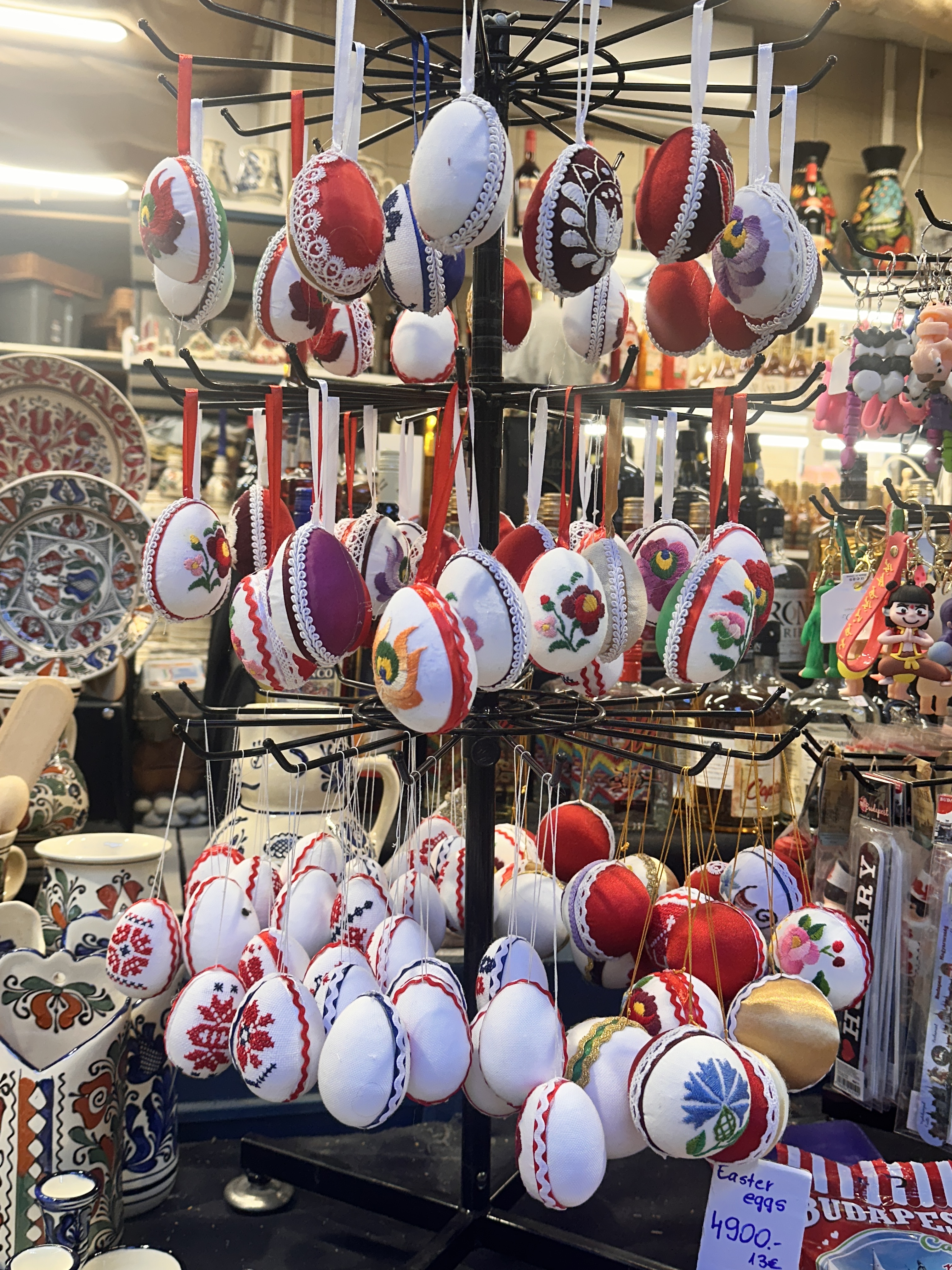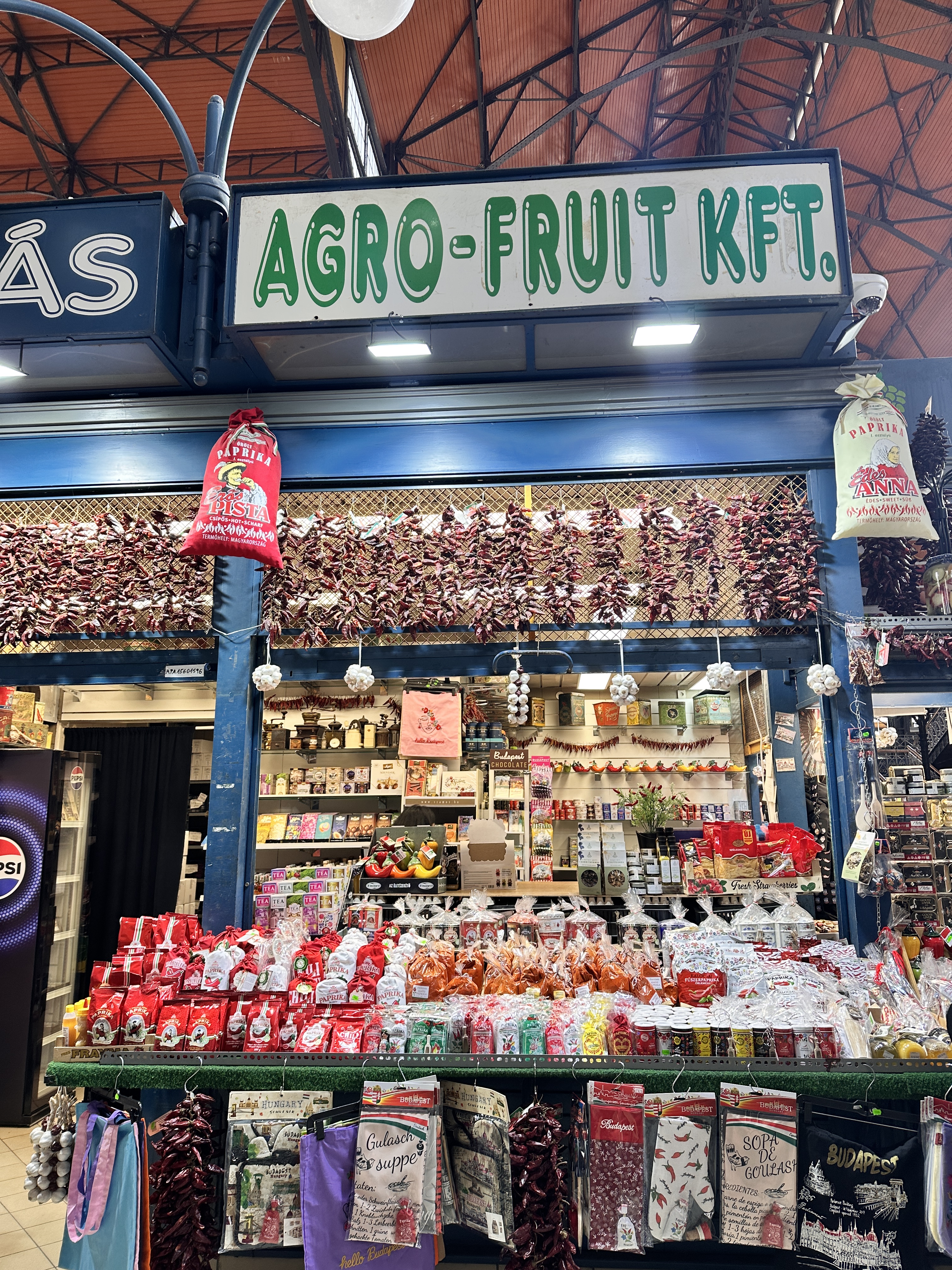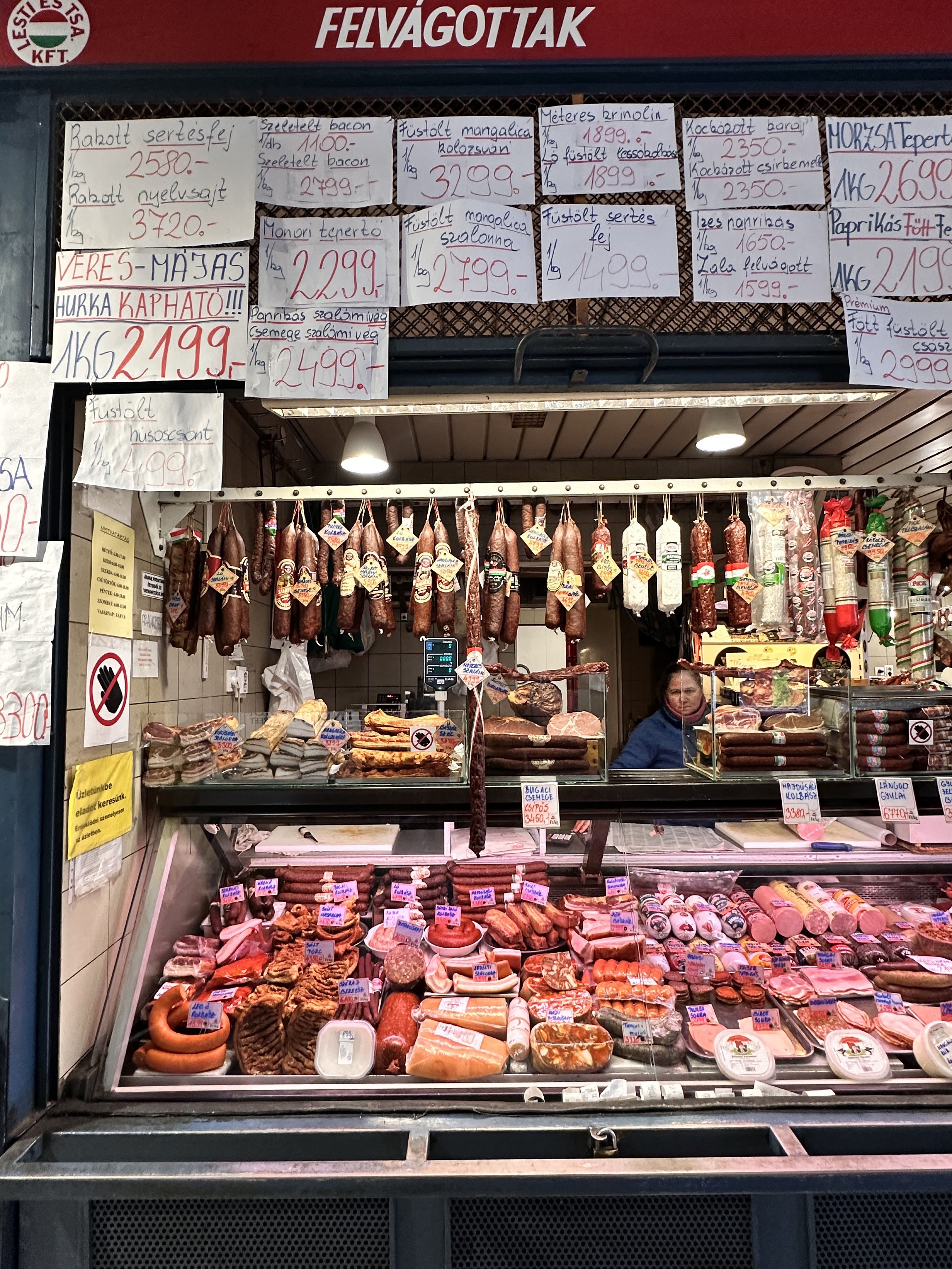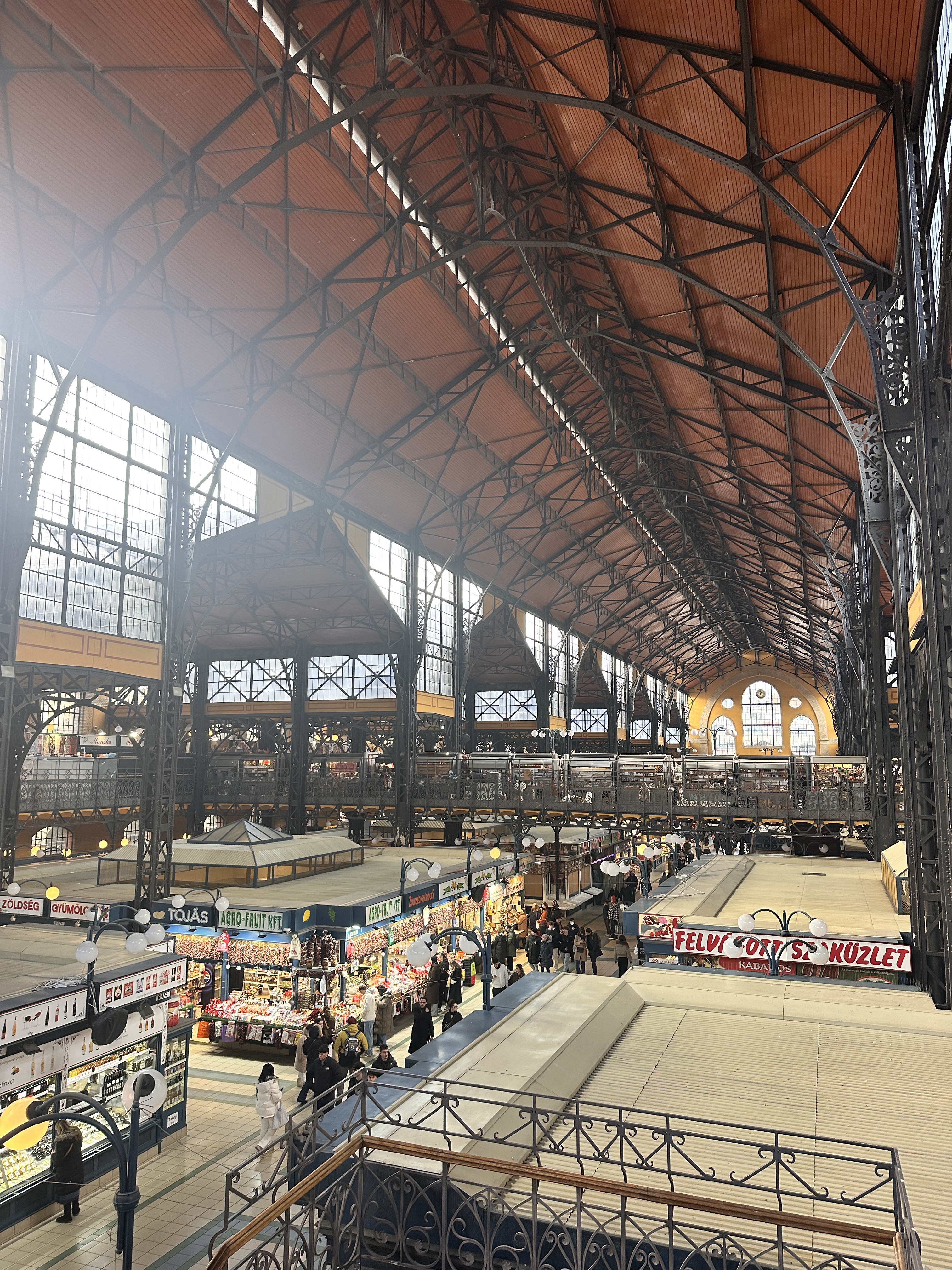Restored in the 1990s the Neo-Gothic building was pretty spectacular. It has two storeys filled with Hungarian foods – a lot of salami – and crafts including a lot of Christmas decorations. I made a beeline for the hot and sweet smoked paprika in the pretty blue and white tins. The upper level has lots of eating options, where you can stand and watch the throngs below or sit down in a canteen style eatery. We devoured a few large Hungarian sausages known as kolbász, that are seasoned with a distinctive blend of spices, most notably paprika, served alongside some fries, pickles, and mustard. Delicious and £27 for the huge plate below.