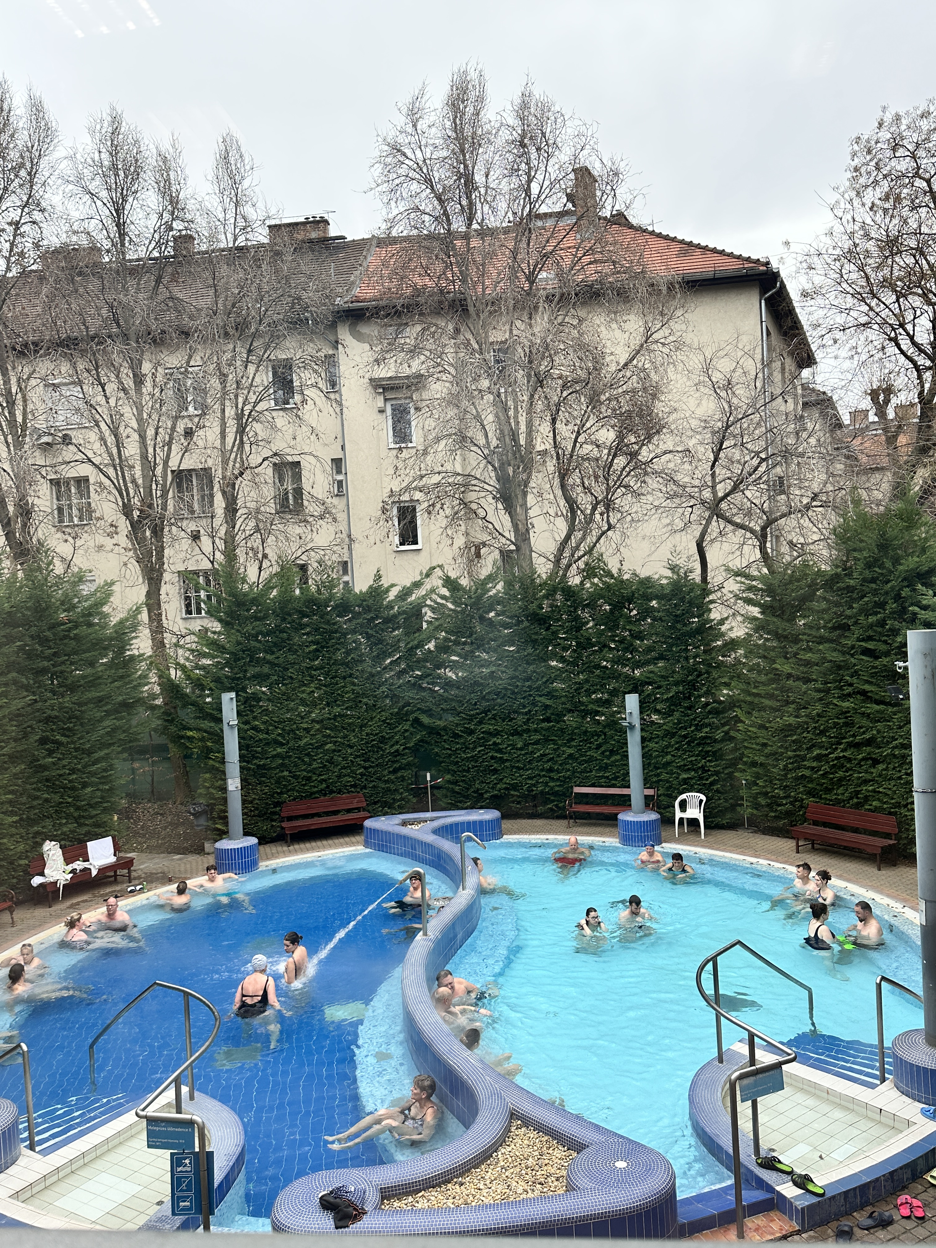 It had a Finnish sauna, a couple of inside pools at 35 and 38 degrees centigrade and a cold plunge. Outside were a further couple of hot pools which we enjoyed the most – being in nature is really calming and relaxing. We found it clean and user-friendly. We didn’t need to wear swim hats and could all go in together. You need to obviously remember a swim suit, flip flops and towels. I believe you can borrow the latter if required. They have large lockers that you can leave all your belongings. There is also the option of massages as well. For £9 you can wallow and hang out there all day so it was quite busy with local mature residents of Budapest catching up with friends and bathing.