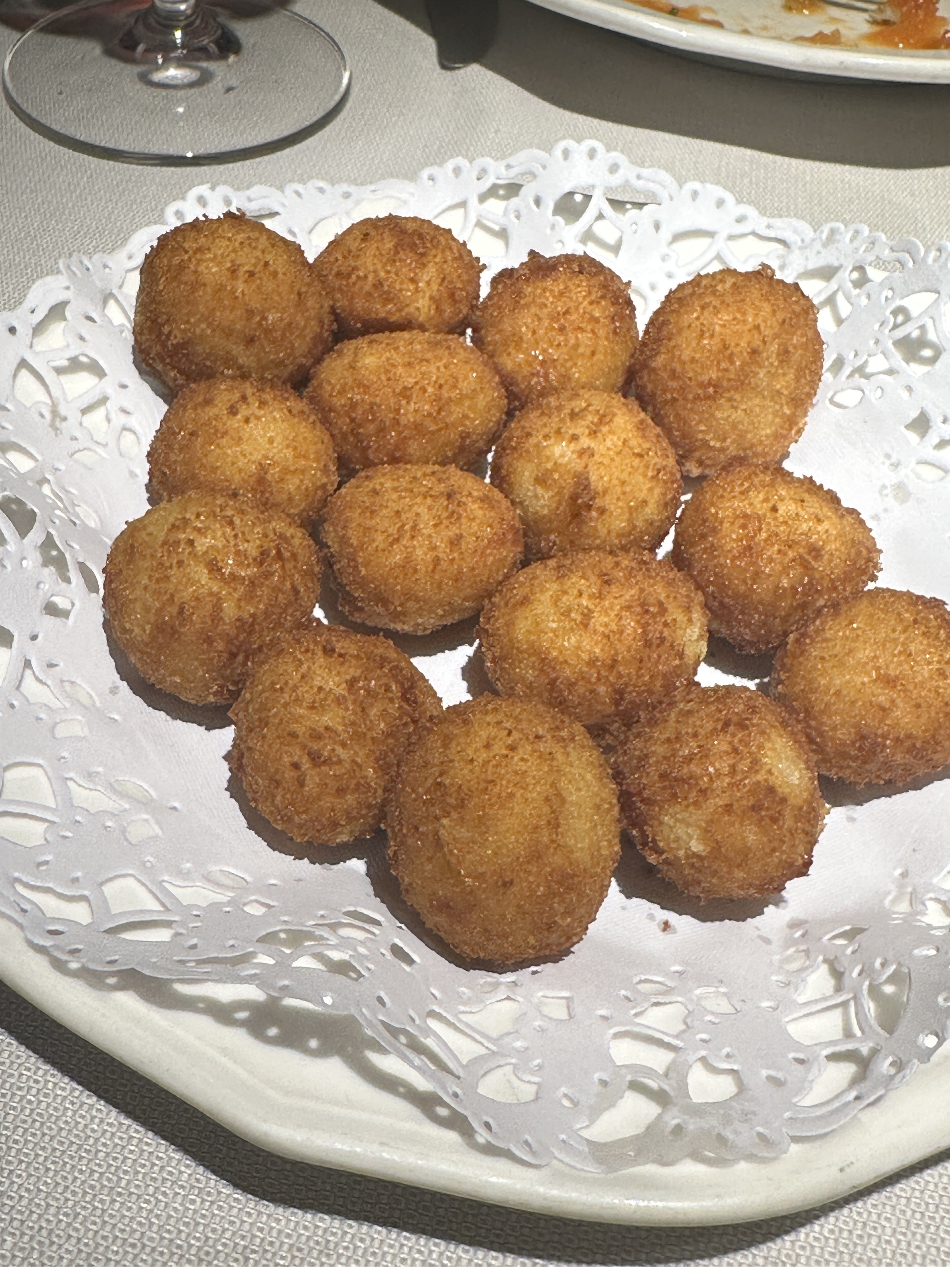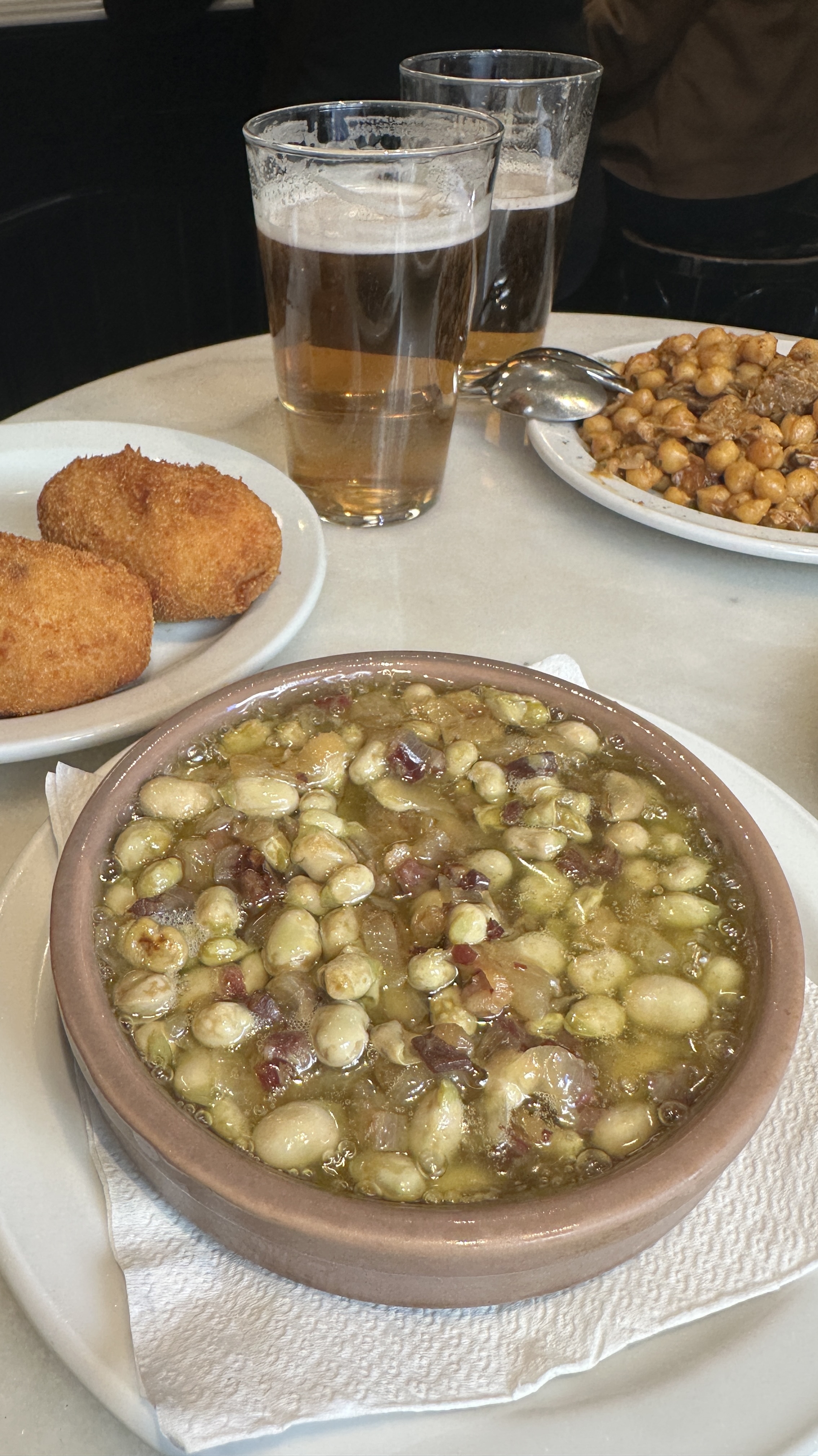 Our plan was to sit in the restaurant part of this establishment, for a more leisure lunch, but alas we were only given the option of tapas at the bar as we arrived quite late for lunch. So we perched on high stools and chose some tasty eats to give us a send off before we headed off the airport. There was a distinct absence of green vegetables, however we did order some tasty broad beans, bubbling in olive oil with jamon; most things tended to come with some pork product too. The croquetas de jamon were huge, piping hot and delicious.