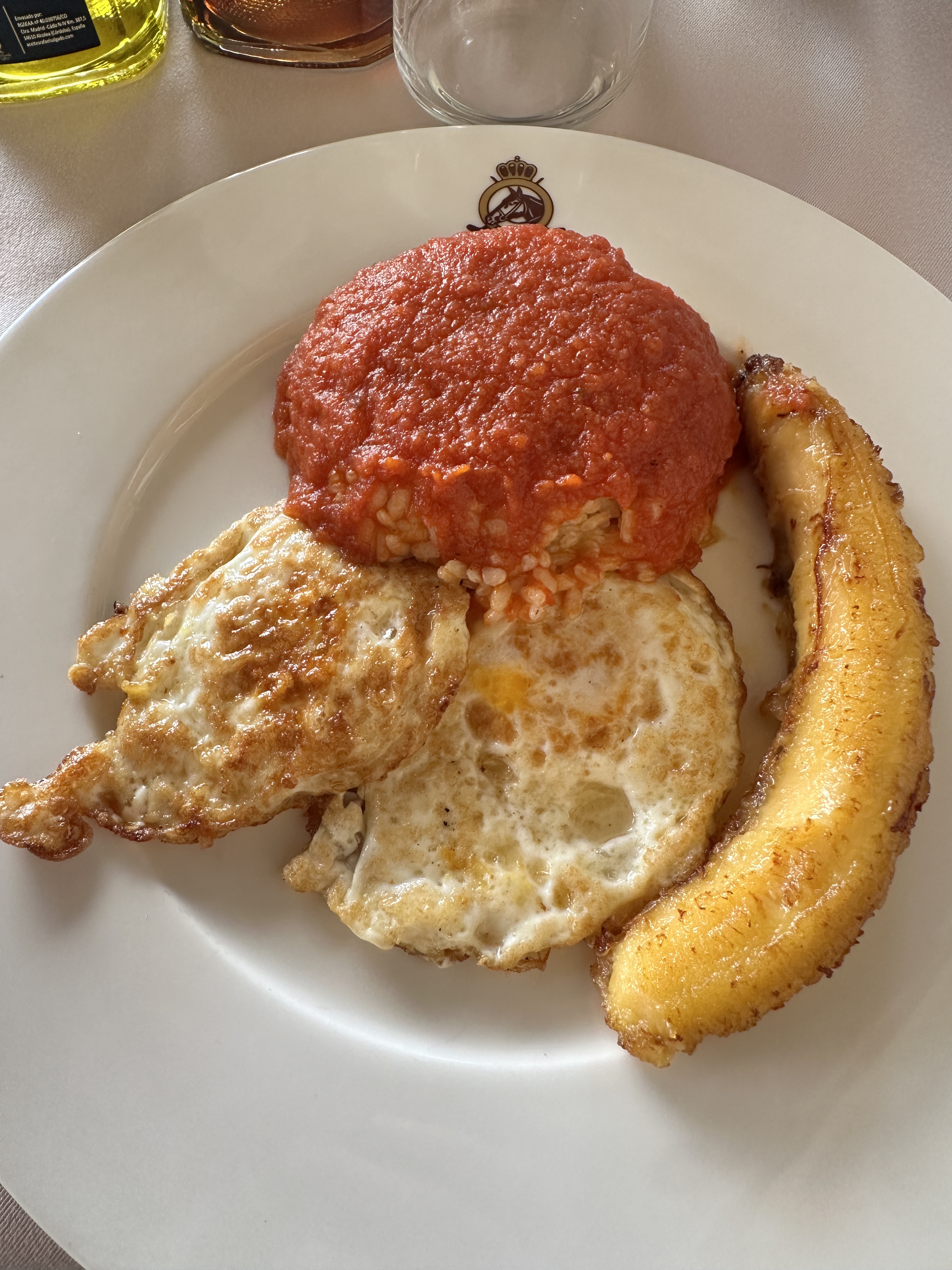 For lunch I was intrigued by one dish our friend chose to eat, which apparently is Spain’s answer to comfort food. It’s called ‘Arroz a la Cuban’ aka Cuban rice and  consists of white rice, fried eggs, tomato sauce, and fried bananas (or plantains). It’s savory-and-sweet combination is popular with all ages – both father and 9yr old son ate the same dish. I’m so intrigued that I plan to make it soon. What are your thoughts on this?
