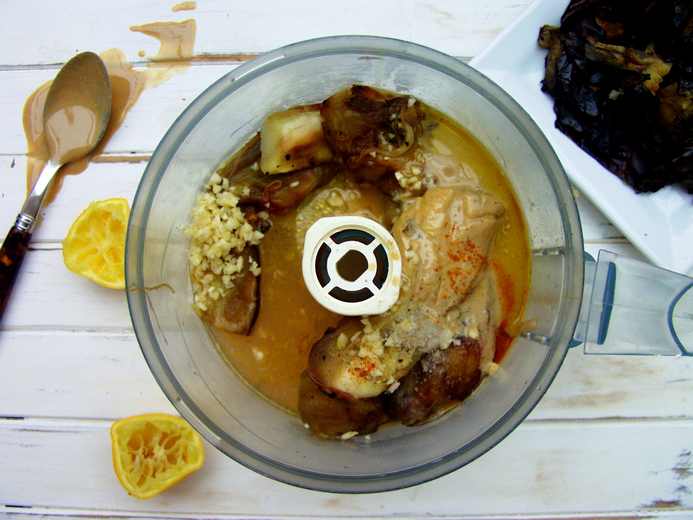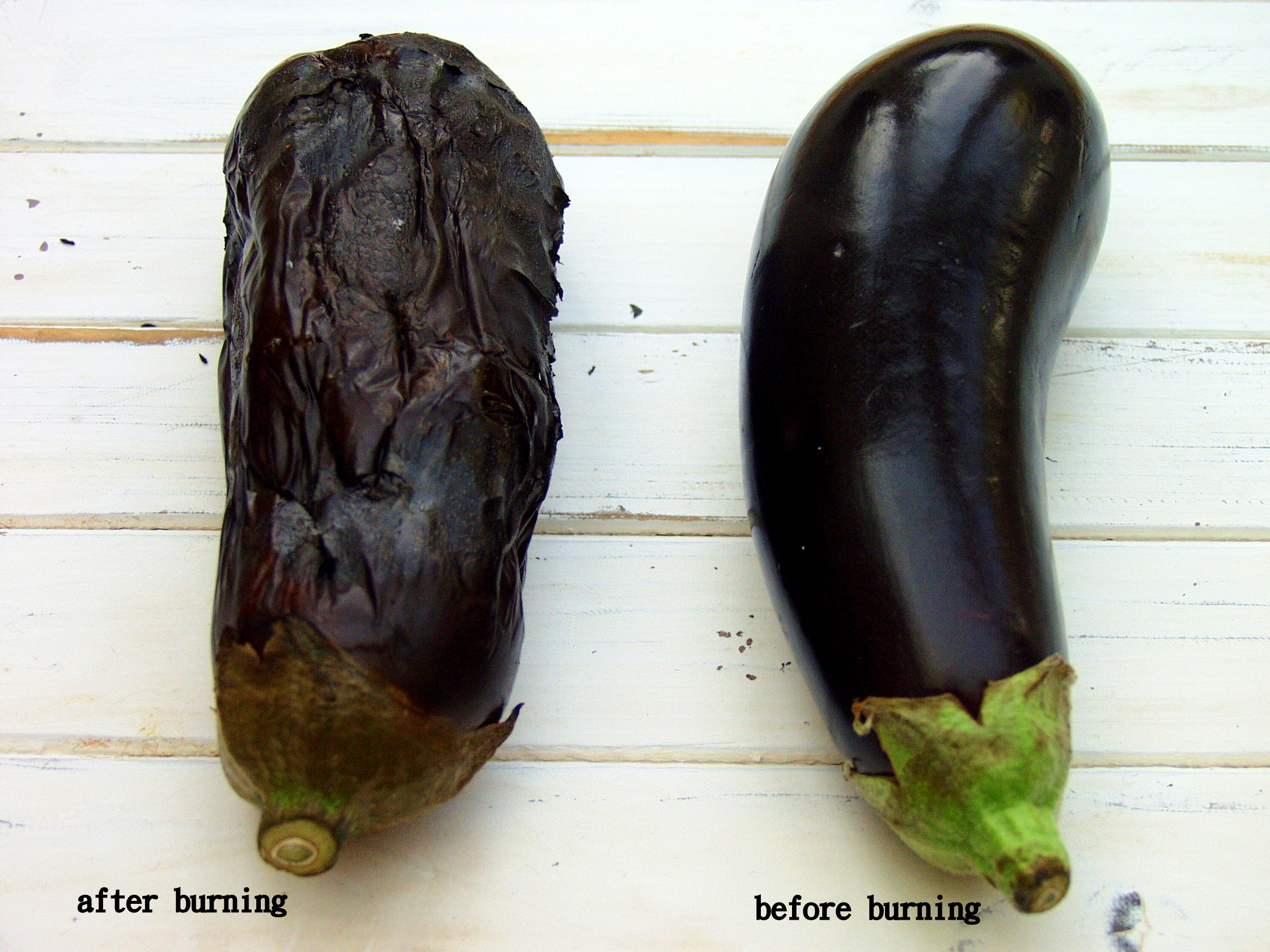 - First you need to place the aubergines over a flame. If you have a gas hob then this works really well. If you do not you can place in the oven for 20-30 minutes, or until the flesh softens, although it won’t have the same smokiness as over an open flame. If you are smoking it over a flame/gas hob it will take around 8 minutes, but you need to use tongs to turn it over so that it is ‘burnt’. Once it is soft and the sides have shrivelled remove from the plan and place on a plate to cool.