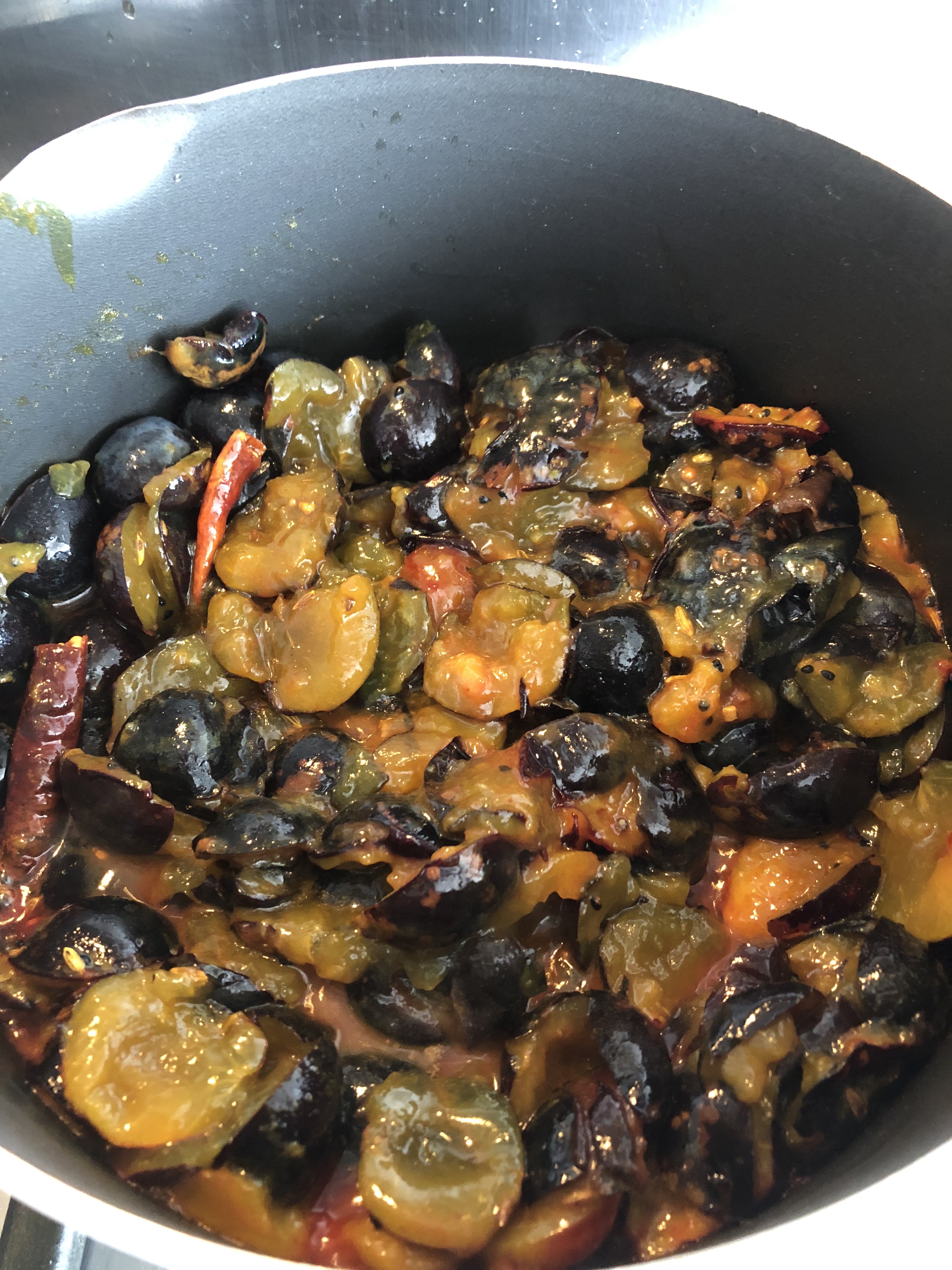 After chatting on instagram with my friend Harriet, aka ‘The Nutritional Bean’ about damsons and what to do them – damson wine or chutney was my go-to response, my mother independently called me moments later to ask if I wanted any. Seeing it as a sign, I said yes and she arrived later that day with said damsons, as well as a bounty of other fruits and veg from the garden. Juicy sweet yellow plums, pears and some runner beans and tomatoes. The damsons were so ripe that they were about to turn and go off, so I felt an Indian achaar (chutney) would be a good way to work with them quickly. Indian achaar is different from those made with vinegar, which allows them to keep for a month or two. An achaar is often made and eaten on the same day with dal, rice and/or curry. Whatever fruit or vegetable that needs eating you can make into an achaar. This is my mango achaar recipe. They are always deliciously tangy, spicy, sweet and sour and work so well with Indian and Sri Lankan food.