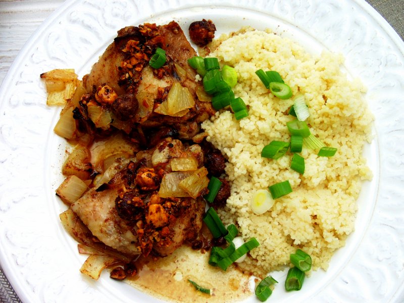7. Serve the chicken with either rice or cous cous and garnish with spring onions – I preferred to do this over the cous cous. There will be plenty of sauce full of deliciousness to serve over the chicken.