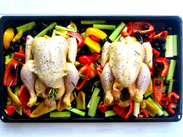 2. Take off any string on the chickens and place a whole lemon – cut in two, into the inside of each chicken along with two rosemary springs in each. Season with pepper and salt and splash the chickens and vegetables liberally with olive oil.