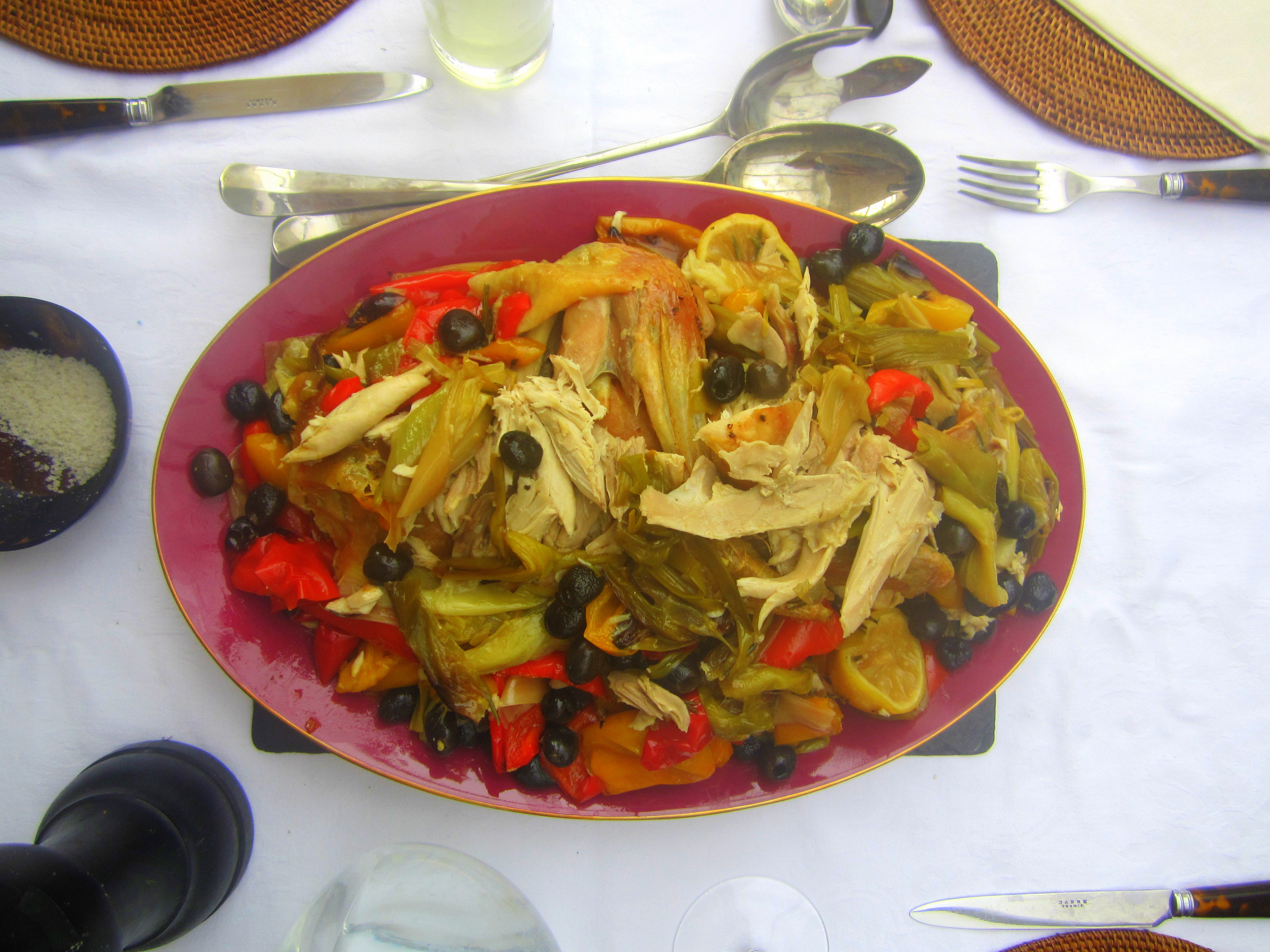 4. Serve on a warm large platter with the chickens cut up in the centre and the vegetables and olives surrounding the meat so that your guests can help themselves.