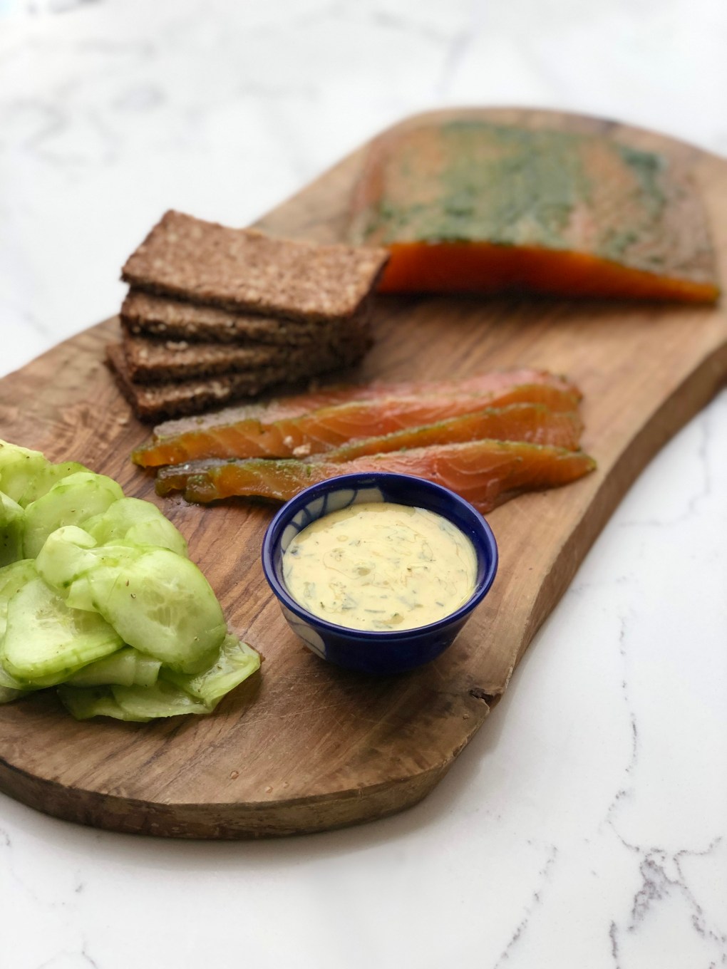 - Place in a bowl ready to accompany the gravlax and pickled cucumber.