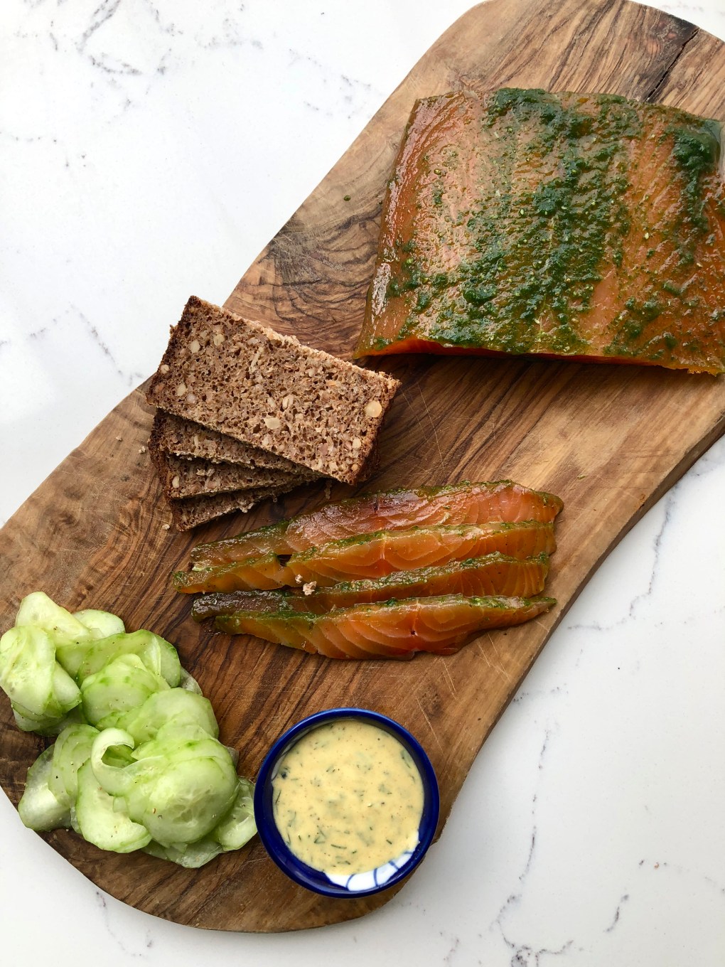 I tend to use the container that the salmon comes in to cure it, which makes it all very straight forward and fuss free. If you want to add a pink hue to the gravlax, simply add a small grated beetroot when you add the fresh dill to begin with. Sometimes I also like to add juniper berries, which I crush and add to the curing ingredients (no more than 2 tsp). I like to cure the salmon for 48 hours, by which time it has hardened and taken on the wonderful flavours it has been curing in.