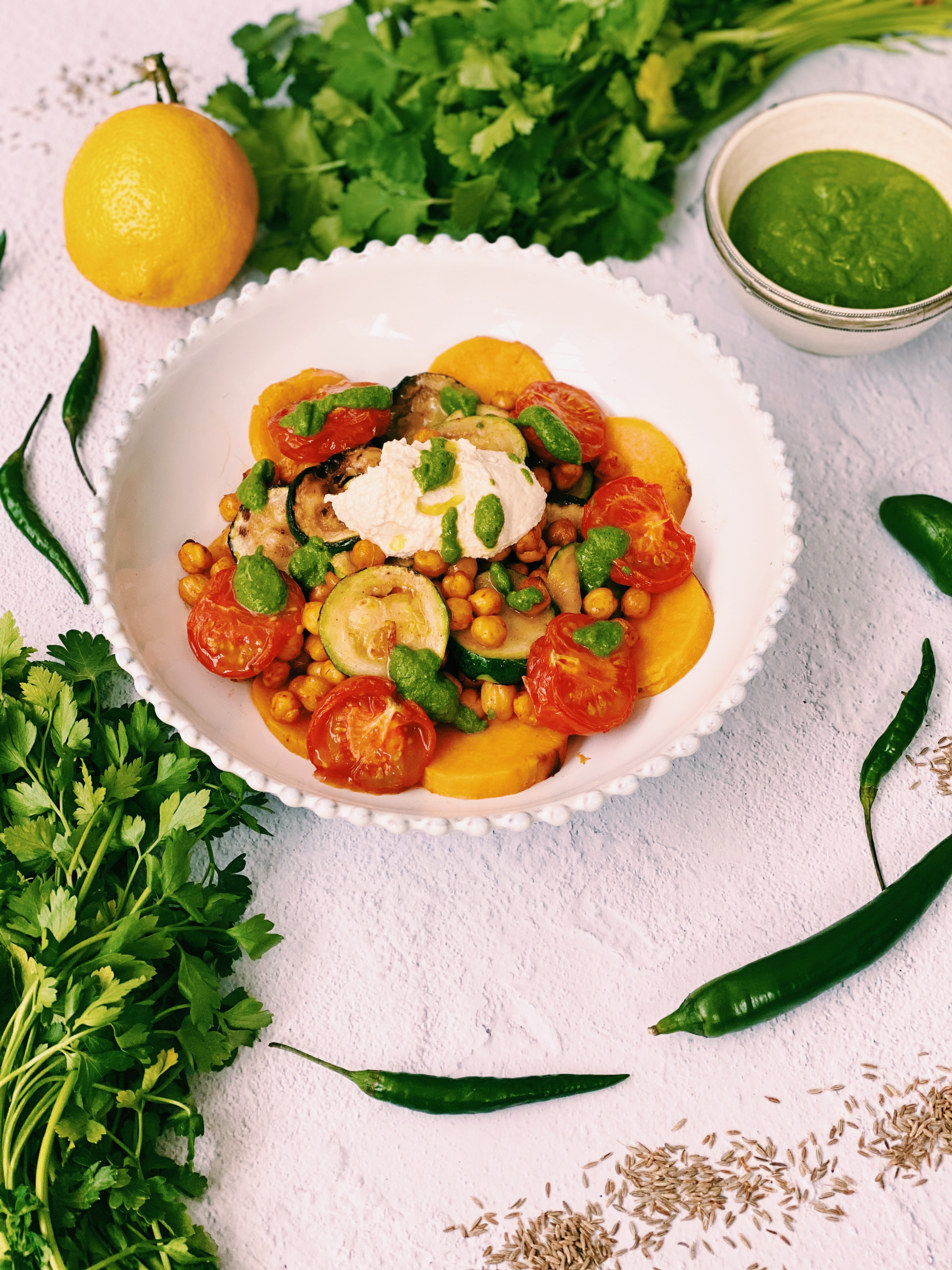 - To plate up, remove the skin from the sweet potato (optional) and slice up. Add some to a bowl along with some chickpeas, courgette, tomatoes. Add a dollop of hummus and some zhoug and finally a drizzle of extra virgin olive oil.