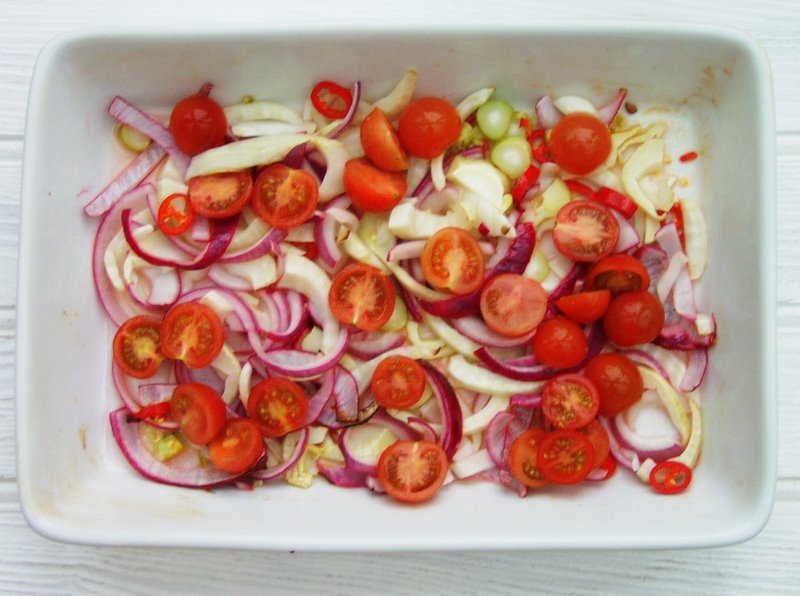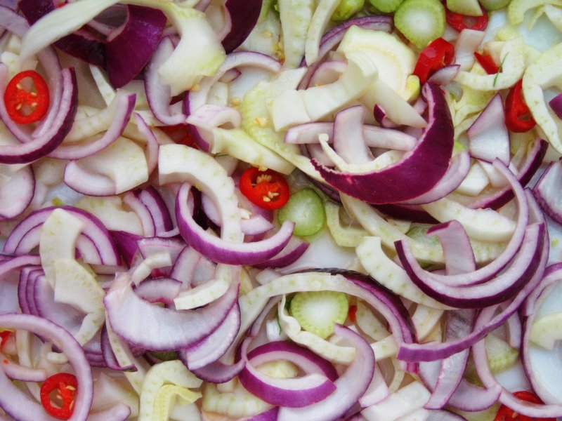 1. Warm a pan/skillet and then add a little oil and the chopped red onion. Fry for 2-3 minutes before adding any other ingredients.