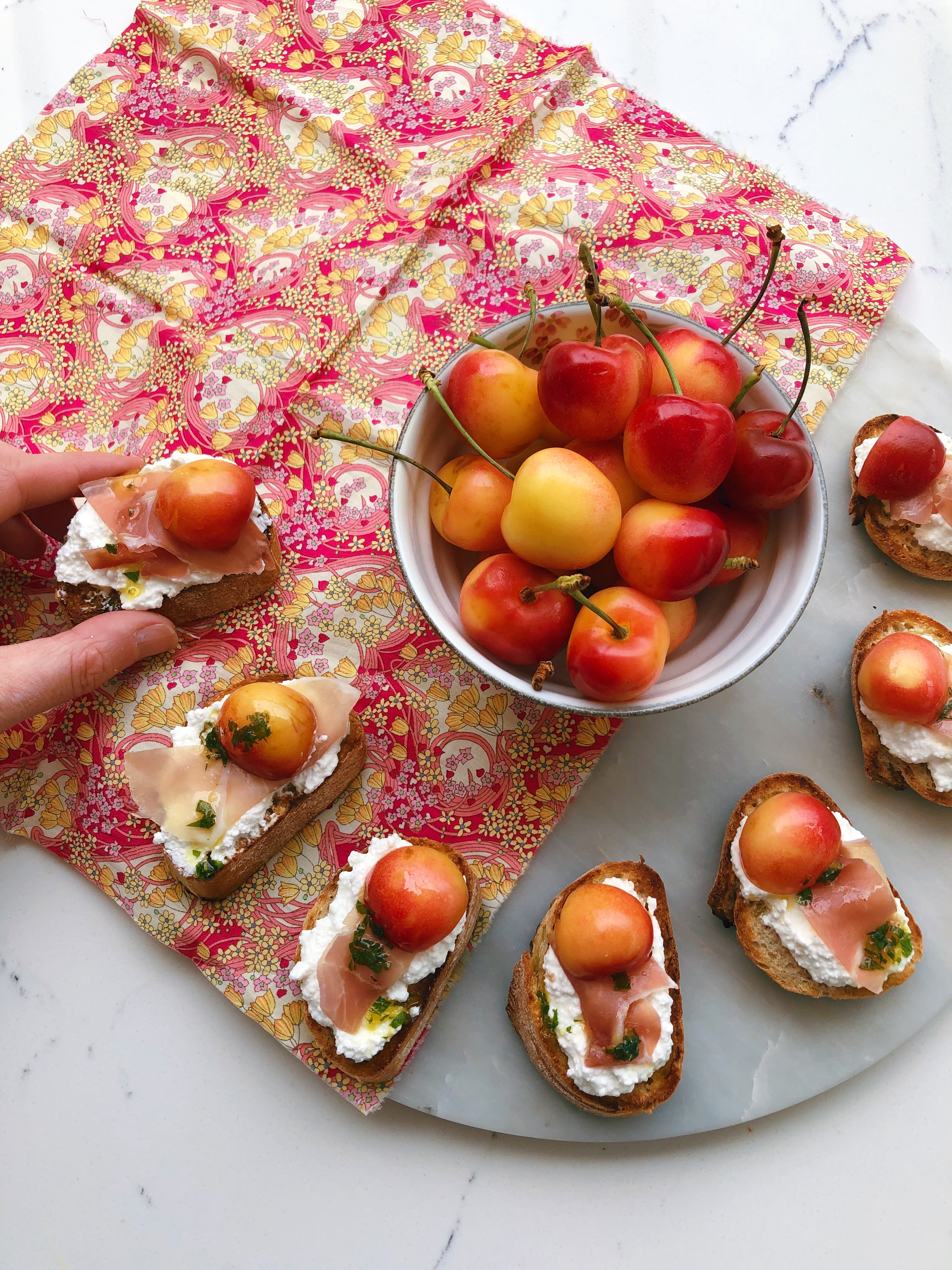 Rainier Cherries, Soft Goats Cheese, Prosciutto and Mint Oil Crostini