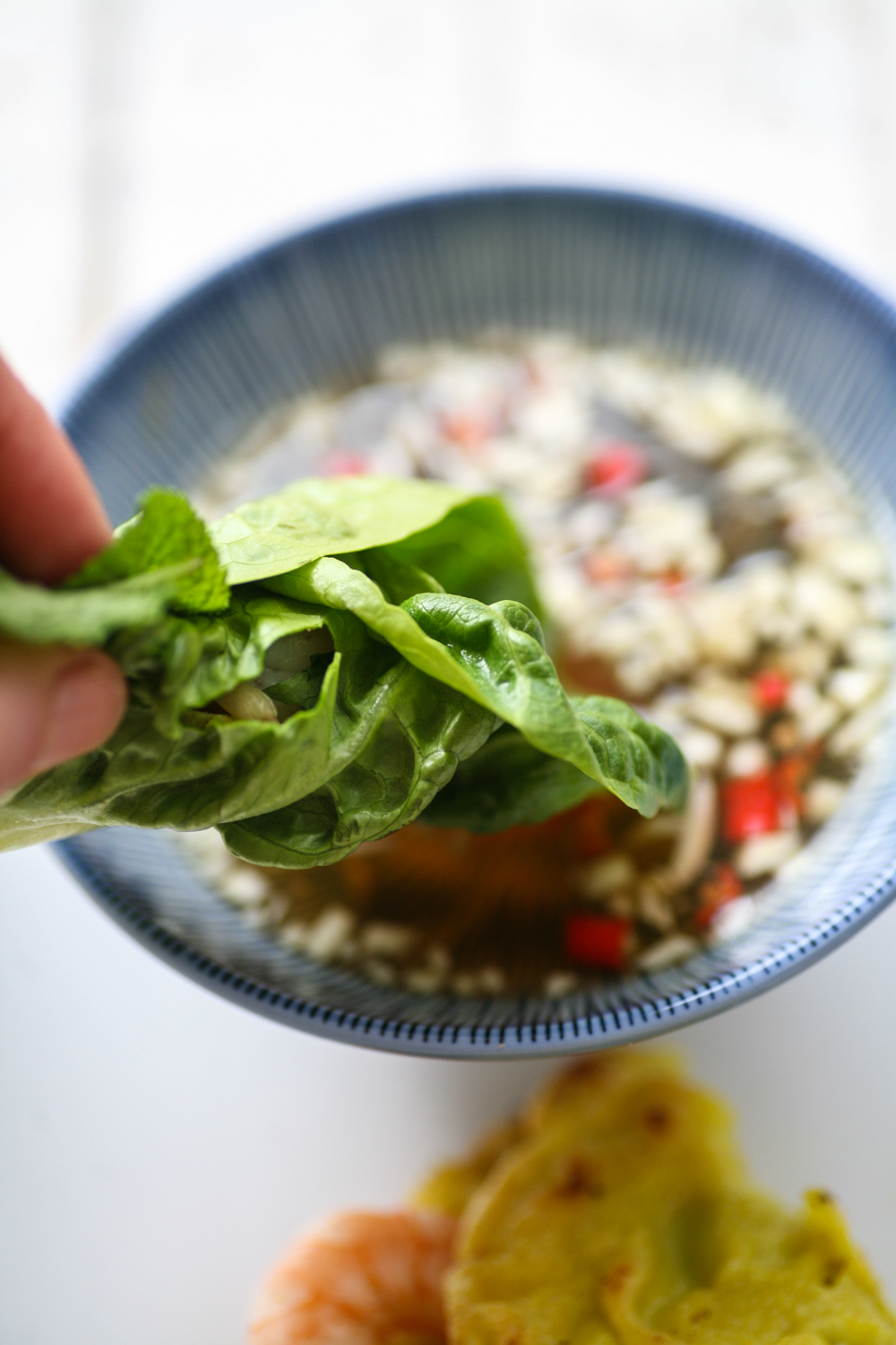 Serve immediately when it is hot. Cut a bite sized portion off the pancake and place on a lettuce leaf. Add a few more herbs and then roll so that you can pick it up and dip it into the nuoc cham dipping sauce.