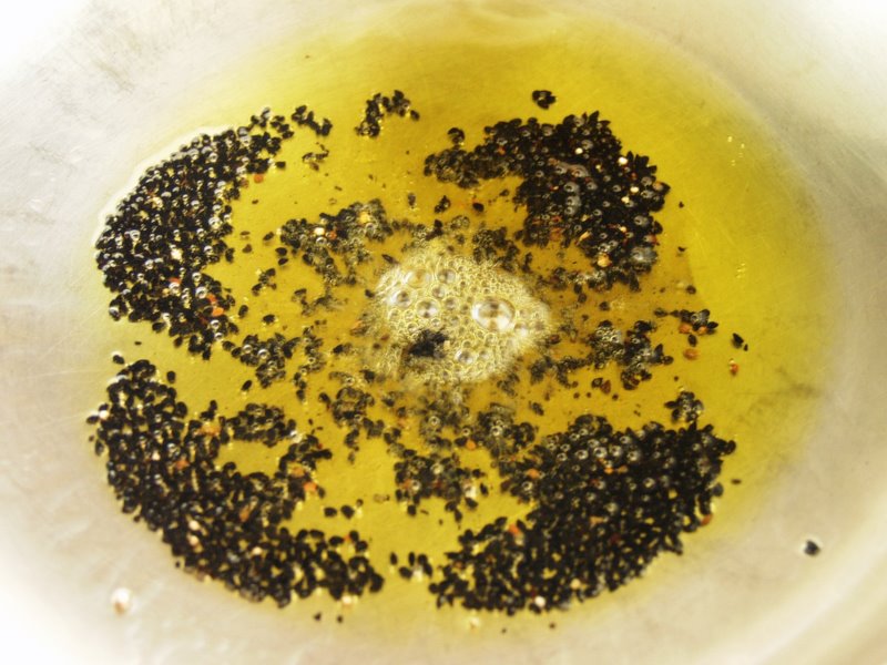 2. Add a little more vegetable oil if it is running dry and keeping the oil at a low heat add the black mustard seeds. They will burst open and sizzle so make sure the oil is not too hot as they will spit! Add the bay leaves and stir with the black mustard seeds.